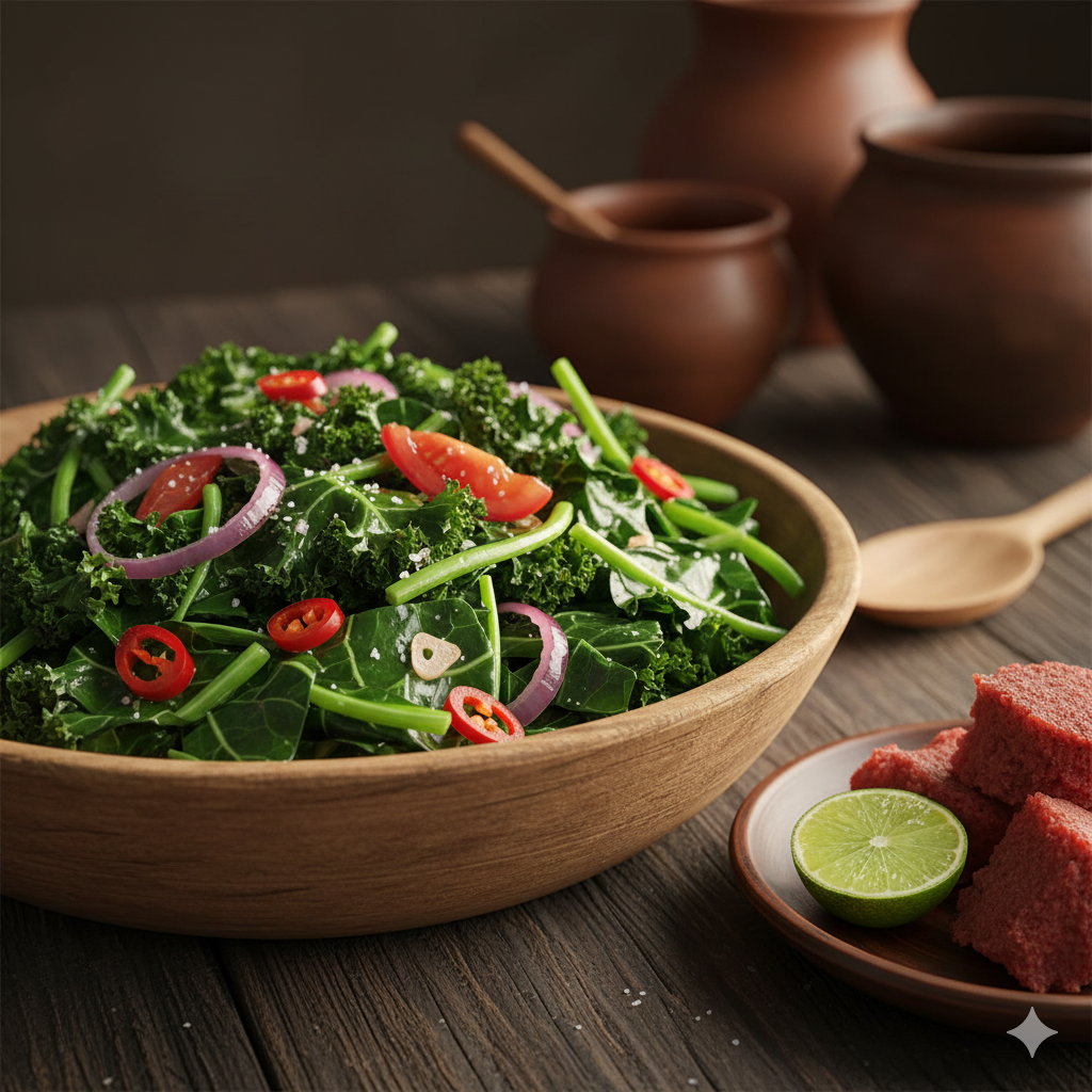 Hearty collard greens simmered with tomatoes, onions, and garlic — a nutritious staple that celebrates Kenya’s farm-fresh produce.