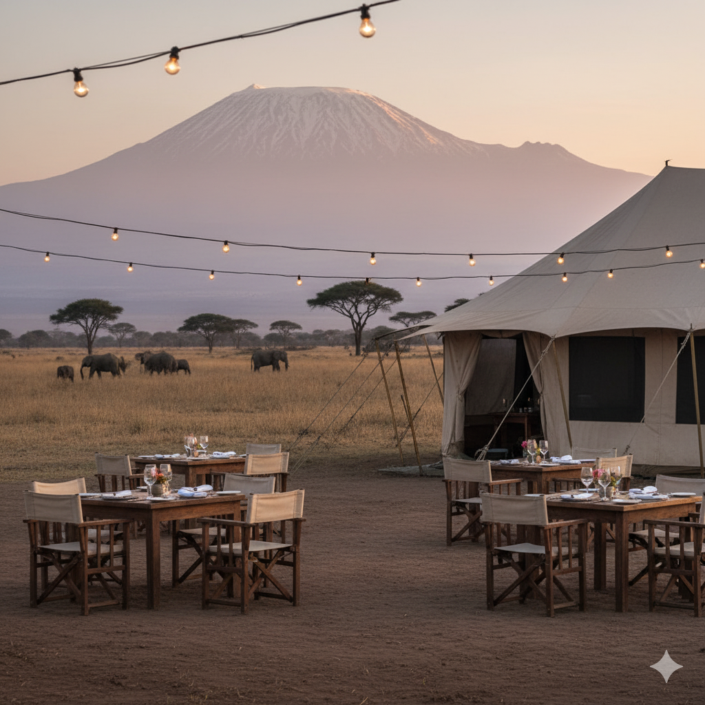 Our open-air restaurant offers panoramic views of Mount Kilimanjaro and the endless Amboseli plains, creating an unforgettable backdrop for every meal.