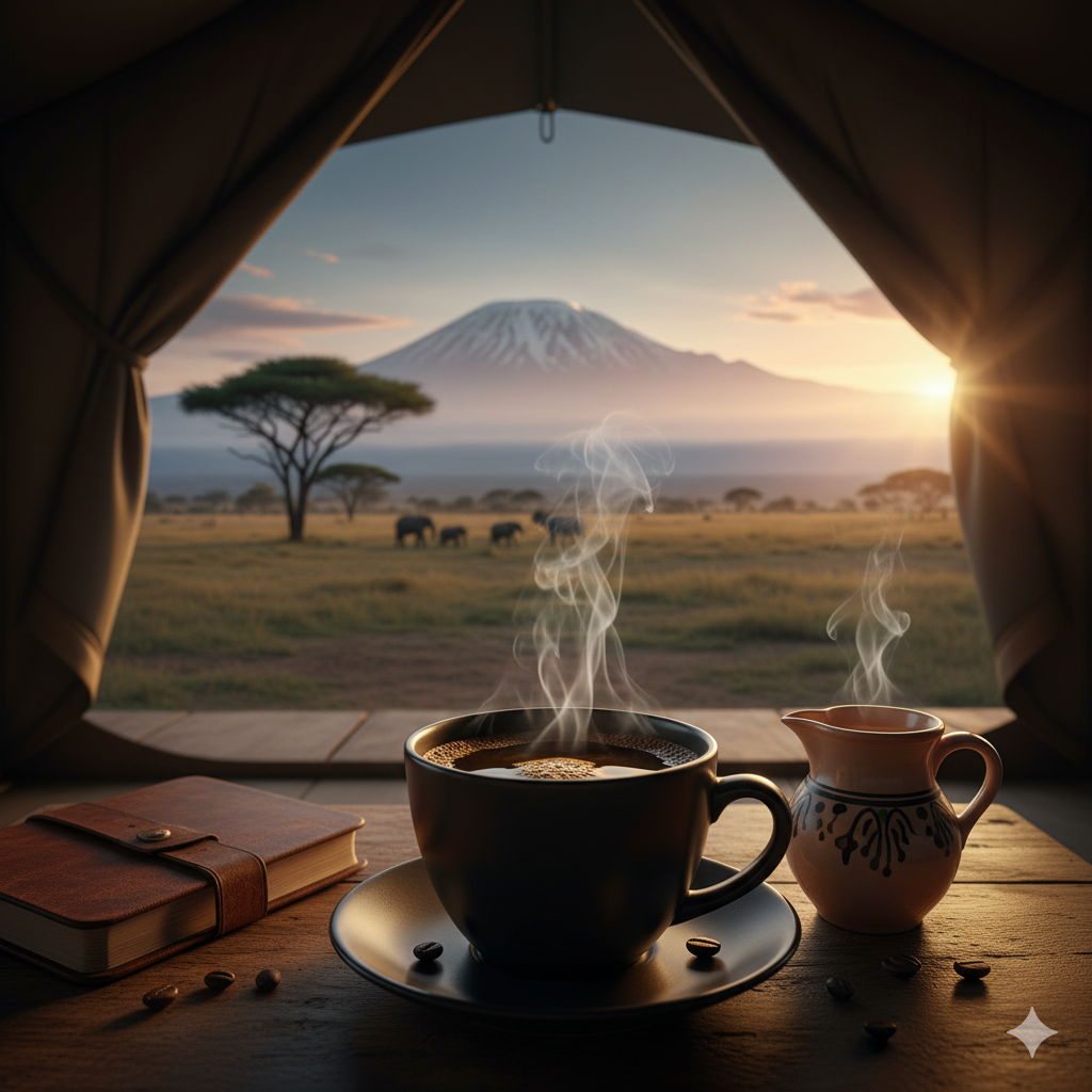 Freshly brewed coffee from the slopes of Kilimanjaro, rich in flavor and heritage — served with a view of the mountain itself.