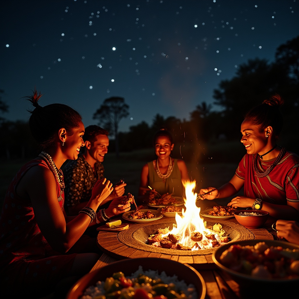 An unforgettable outdoor feast under the stars featuring grilled meats, fresh salads, and traditional sides with live Maasai music.
